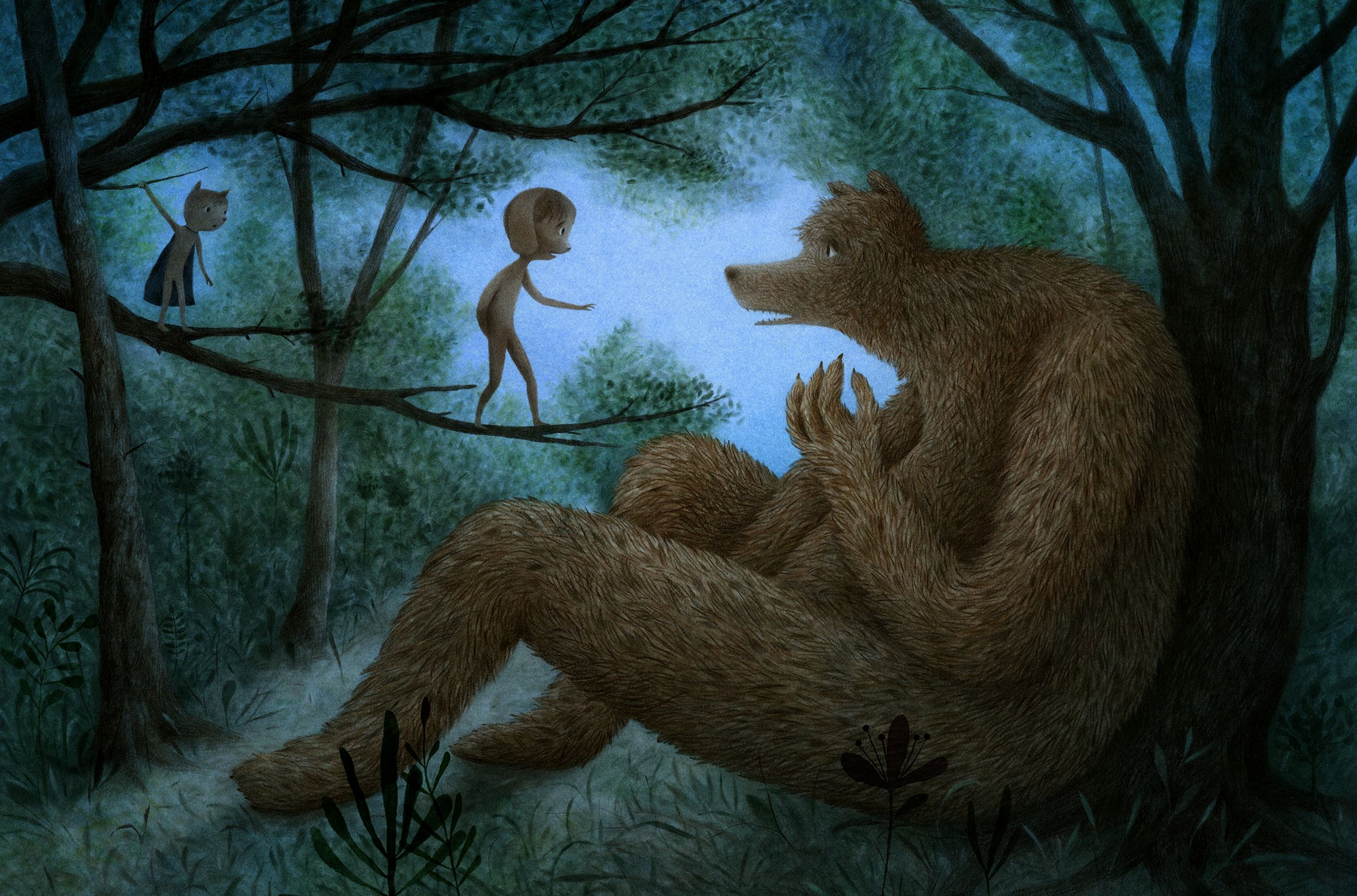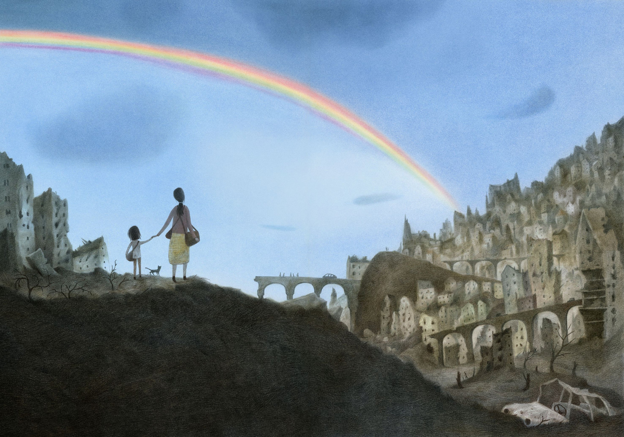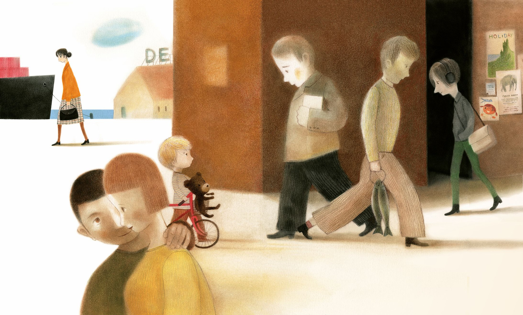 His illustrations are created using a combination of traditional and digital techniques. He begins at the drawing table mainly with soft pastels and crayons, building up the colours and atmosphere by hand. The artwork is then developed further on the computer, where he adds details, adjusts tones, and refines the final images while keeping the soft, hand-drawn expression that characterizes much of his work.