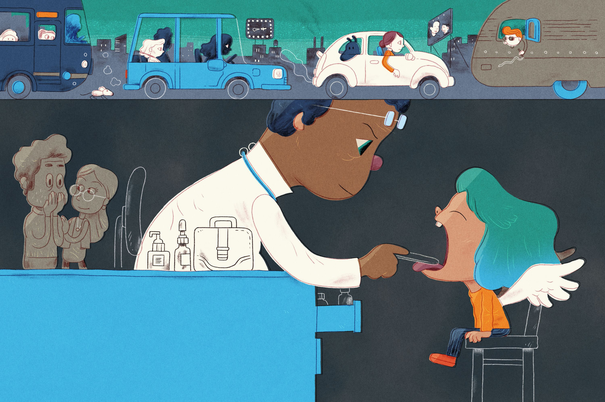 His style is predominantly line-based, combining bold shapes with partial detail, texture and stylised highlights. He favours physical sketchbooks for preliminary studies and concept work, while doing final illustrations digitally – often incorporating scanned, handmade textures.
